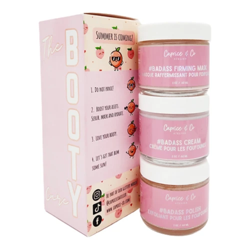 The star ingredient in our products is caffeine, which is known for its ability to firm and invigorate the skin. Combined with the soothing and hydrating properties of aloe vera, your skin will feel soft, supple, and rejuvenated. The addition of mango and guava extracts provides a burst of antioxidants and vitamins that nourish and protect your skin from environmental stressors. Our 100% natural and vegan formula means that you can indulge in the ultimate booty care experience without worrying about harsh chemicals or synthetic ingredients. Our gentle yet effective scrub, mask, and lotion work together to refine, detox, and hydrate your skin, leaving you with a silky smooth and glowing derriere.