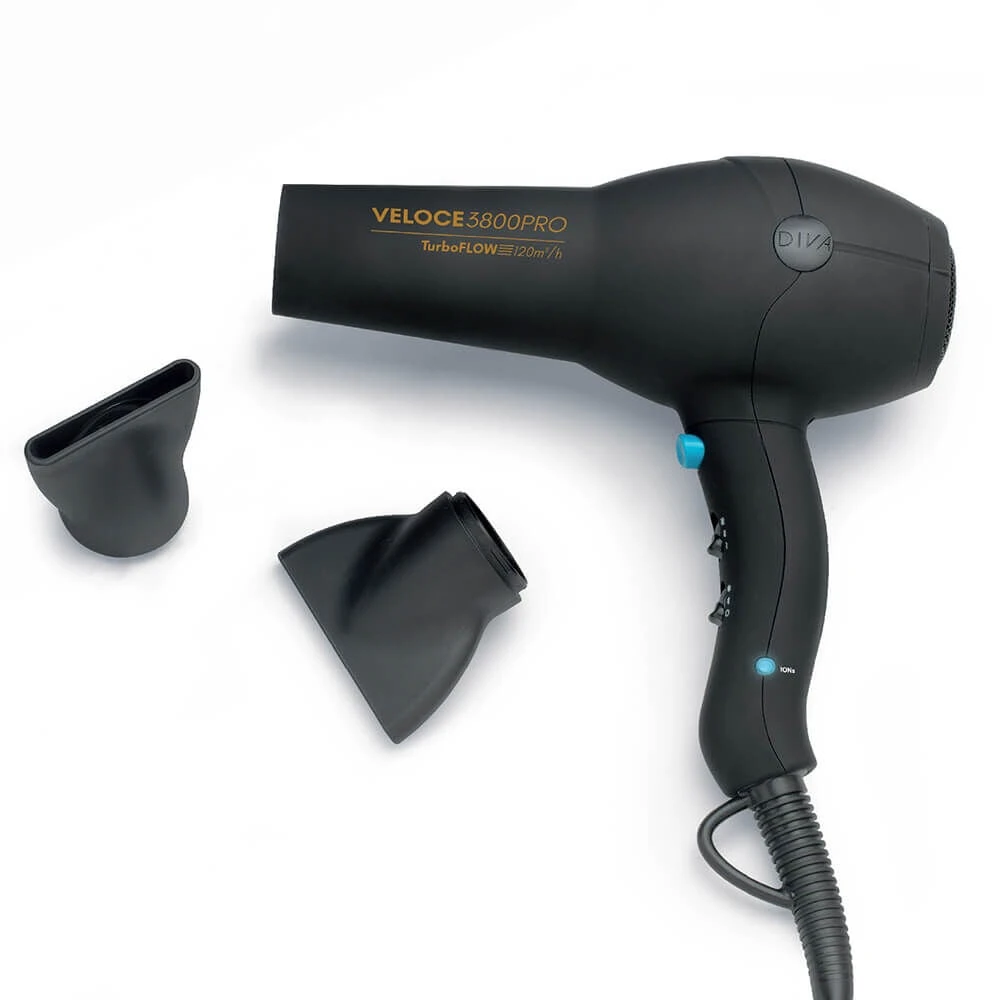 The Diva Edit Veloce 3800 Pro Dryer delivers a salon quality blow dry. The Veloce 3800 Pro offers styling that is tailored to different hair types, choose from 4 heat and 2 speed settings to deliver smooth, sleek results. Ionic conditioning eliminates frizz and static and the True Cold Shot setting provides a blast of cool air to set hairstyles. High power at 2200W with a high precision thermostat and an airflow of 110m³/h, this professional hair dryer will transform hair and deliver the ultimate salon blow dry.