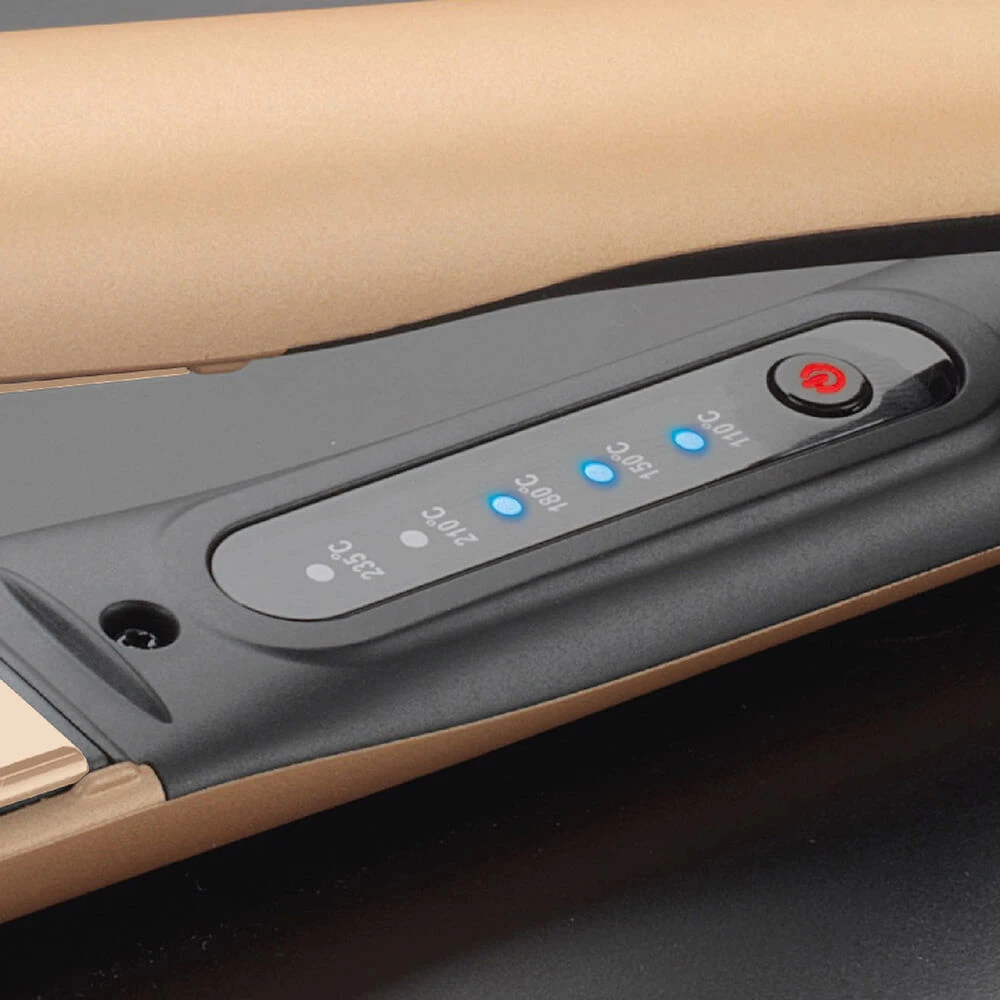 The Diva Precious Metals Touch Straightener features Macadamia, Argan Oil and Keratin infused ceramic floating plates with ionic conditioning to control frizz for sleek, shiny, professional results. The easy-to-use swipe temperature control panel allows you to choose the perfect styling temperature for your hair type, ranging from 110°C- 235°C. Heat-up and heat recovery is instant; 7 seconds to 110°C, and just 18 seconds to 180°C, with ultra even heat system to enable consistent styling. The slim, smooth, rounded barrel is perfect for easily creating curls and flicks. Includes a salon length, heat-proof 3m swivel cord for fuss-free styling, and automatic shut-off after 60 minutes for piece of mind. Multi voltage UK/EU plug adaptor for styling anywhere in the world.