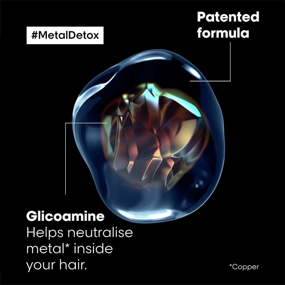 Wash after wash, excess metal penetrates inside the hair. Metal* particles create a risk of breakage and colour shift. Enriched with Glicoamine, the Metal Detox Oil protects hair from the deposit of metal particles.