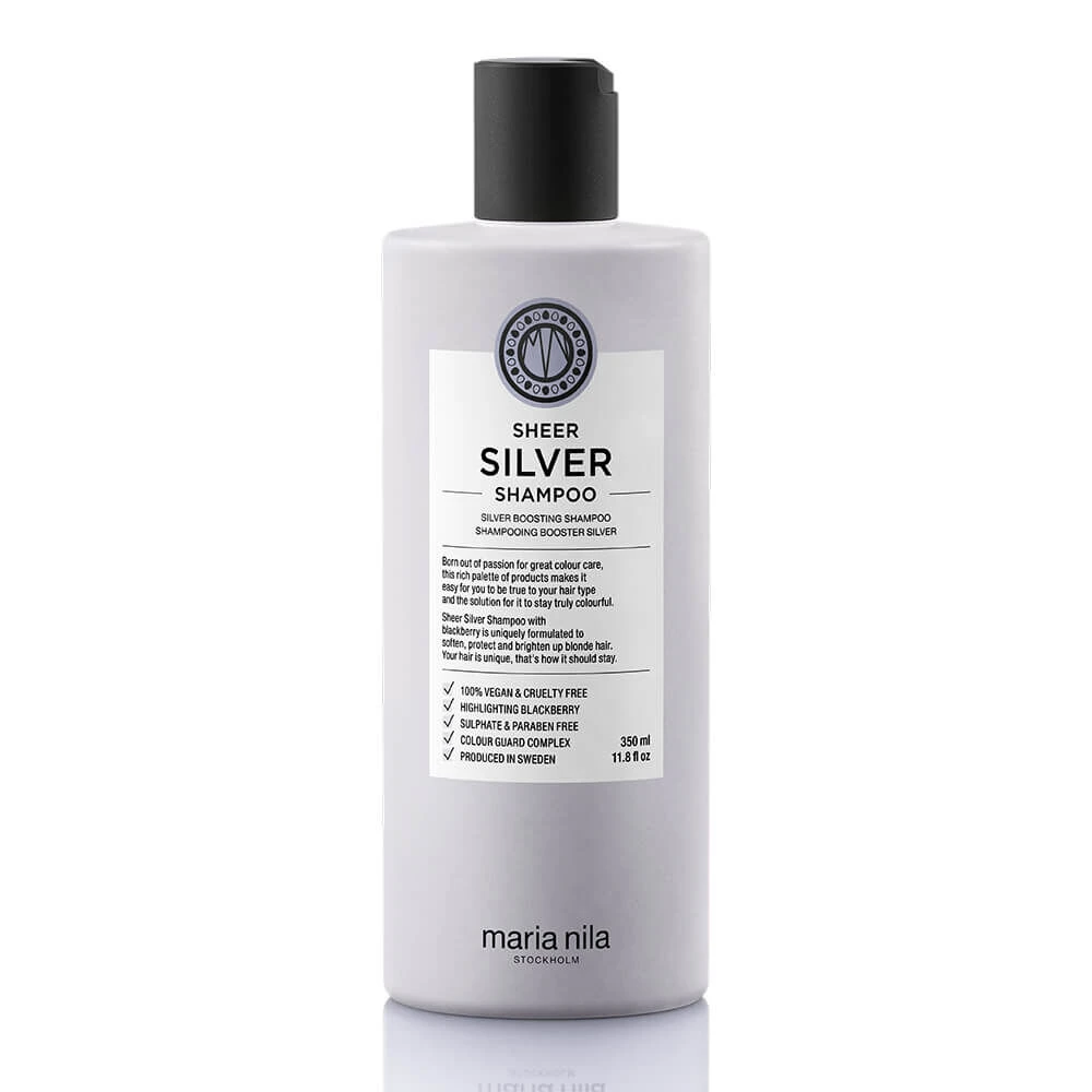 Sheer Silver Shampoo from Maria Nila is a sulphate and paraben-free hair cleanser for blonde and dark hair. Contains violet pigments and blackberry extract to neutralise golden shades while adding shine and strength to the hair structure. With Colour Guard Complex to protect hair and reduce the colour loss associated with washing, heat styling, UV rays and free radicals. Bottle size 350ml.