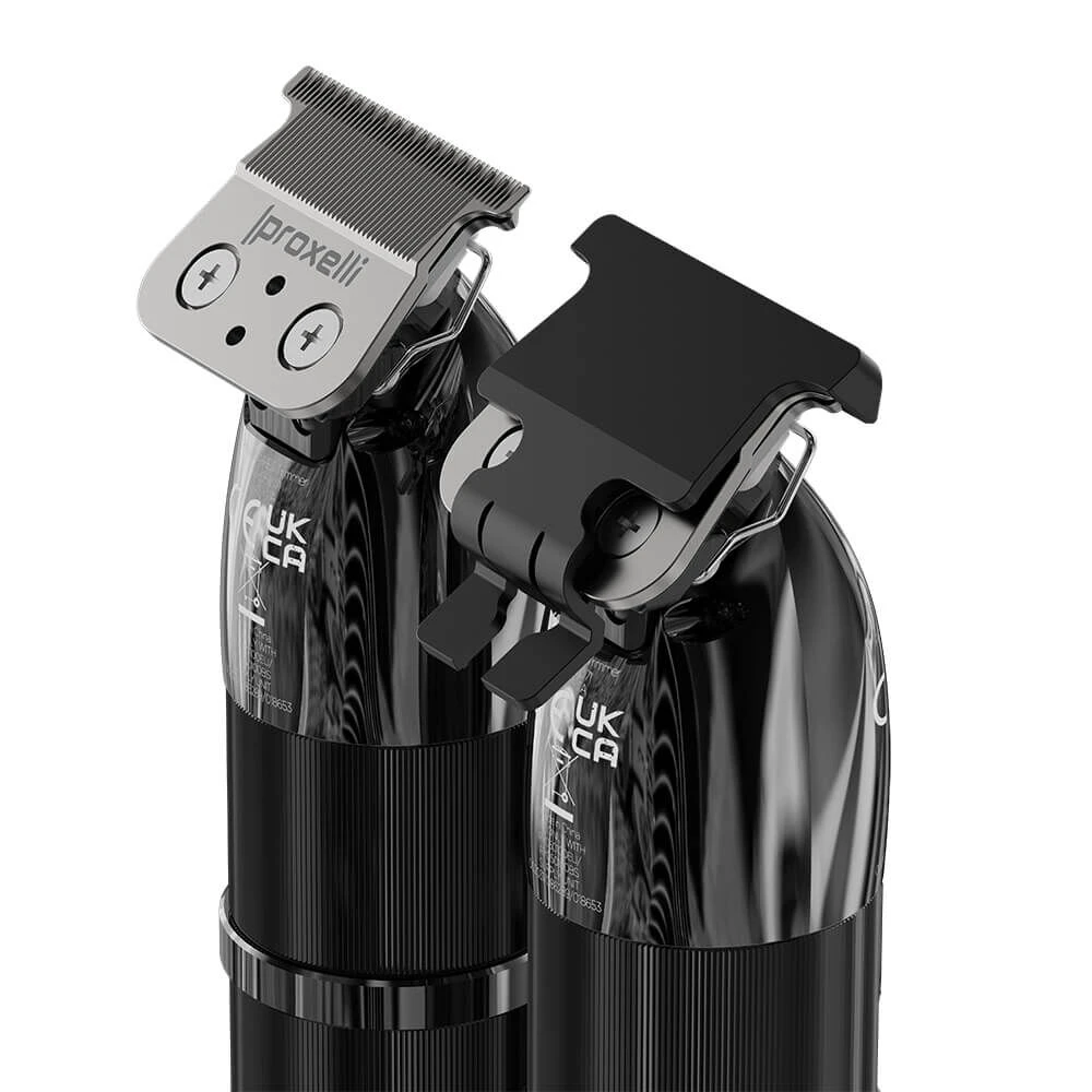 The Proxelli ARES Professional Trimmer features a 360° exposed ultra sharp T-blade to allow barbers to create and cut with precision, with a revolutionary blade that remains cool to the touch. The smart-clip technology senses blade resistance and revs up the motor speed, so the trimmer will never drag or stall. The lithium battery is fully charged in 2 hours and delivers a 2 hour run time, with an indicator light to show battery status. The superior motor boasts 7000RPM while being ultra quiet, with a noise level below 62dB. Can be used corded or cordless.