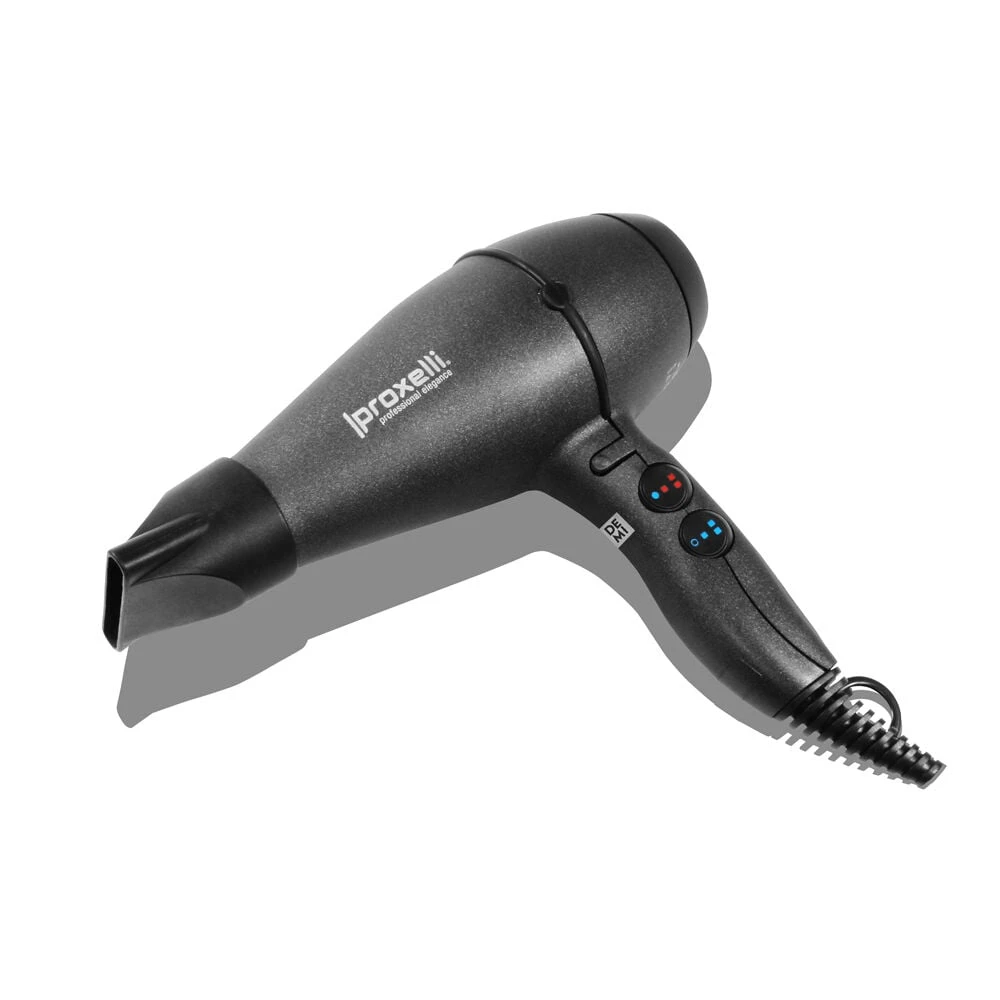 Proxelli – your power master; 2500W for professional use. 4x heat adjustment settings with cold shot, and 2x speed settings. Ergonomic handle (right & left-handed). Removable stainless steel filter. Rating Power: 2500W. Motor: HC FAST. Includes 2x nozzles. Salon length 3m flex cord. Weight: 525g.