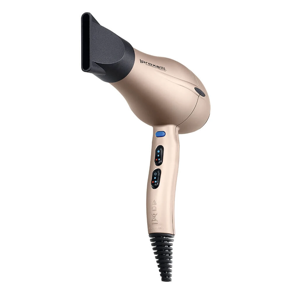Proxelli Maya Champagne Hairdryer. Includes 2 nozzles. Superior quality & energy-saving. Practical & comfortable. Sleek & modern design. Light & balanced.