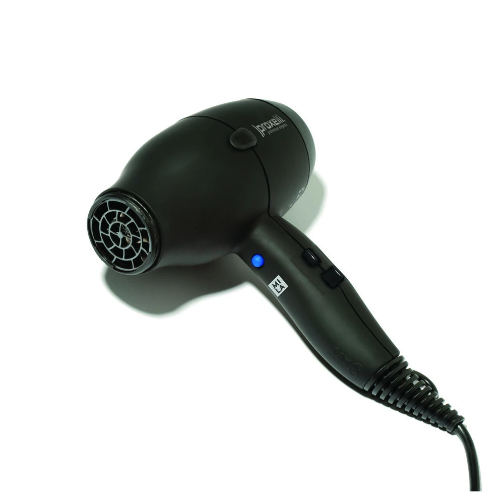 Compact and reliable hairdryer from Proxelli, complete with 1x nozzle and 1x diffuser. 4 heat adjustment settings with cool shot button and 2 speed settings. Rating Power 2000W. Salon length 3 metre flex cord. Weight: 480g.