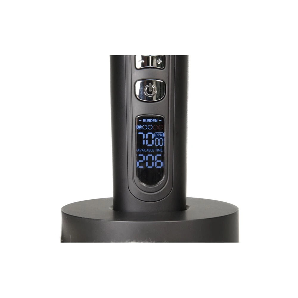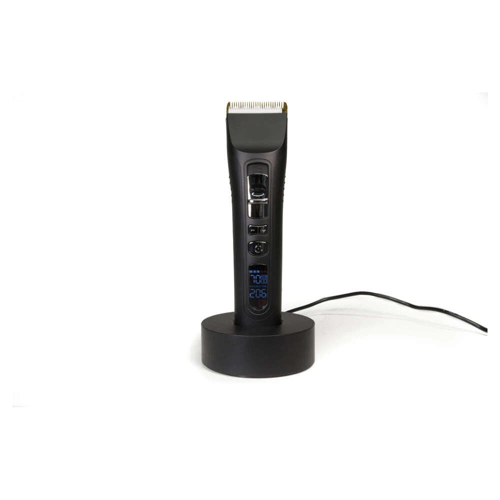 Proxelli Professional Clipper with titanium coated fixed blade combined with ceramic moveable blade. The adjustment mechanism enables 4 levels of precise cutting lengths, with special power adjustment buttons to increase or decrease the engine power speed by 500 Rpm – 5 levels (5000 till 7000 Rpm). The LCD display indicates the burden status of the blade head, the power engine level and remaining operating time (in minutes). For battery use or use with cord, with a rechargeable Lithium-Ion battery: 3,7V, 2200mA. Charge time: 3 hours. Operating time: Minimal 3 hours. Motor type: 3.0V Pivot motor with 5000 2000 RPM. Current: input: 100-240V AC, 50/60Hz. Weight: 225g. Complete with adapter, charger, 2 attachment reversible combs with lenghts 3-6mm and 9-12mm, cleaning brush & oil bottle.