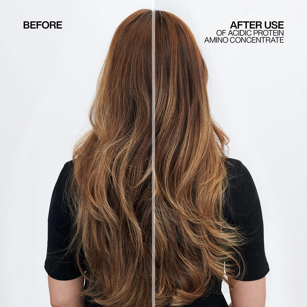 Formulated with 12% Cationic and Amino Acids, Redken Acidic Protein Amino Concentrate is a professional use only treatment to balance the protein levels of hair. When used as a system with Acidic Moisture Concentrate and Acidic pH Sealer, it visibly reverses the appearance of surface damage and reduces breakage by up to 28% in a single use, reducing breakage and repairing strength. Suitable for colour treated hair.