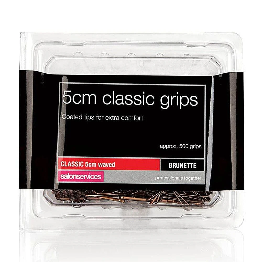 Give perfect hold on hair for styling with Salon Services Classic Hair Grips. Supplied in brown, these waved kirby hair grips can hold hair for styling and keep it out of the face. A 500 Pack. L: 5cm.