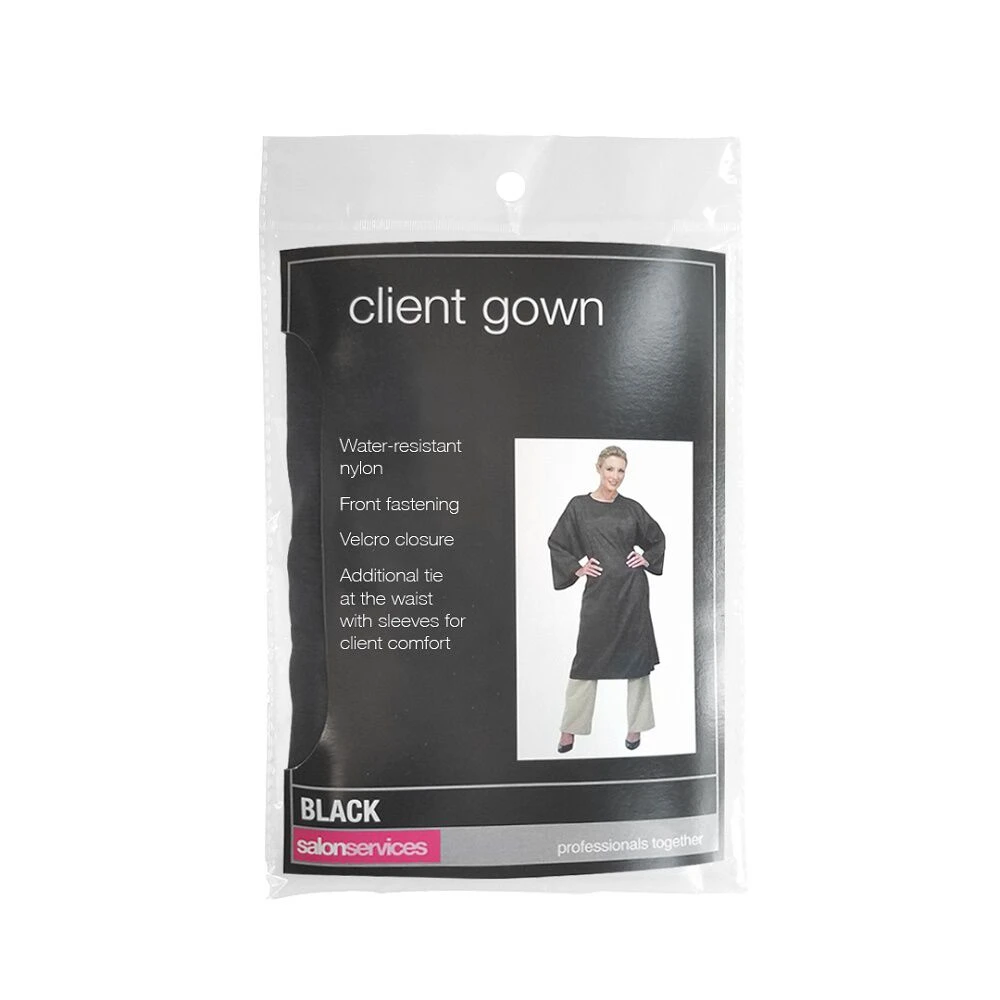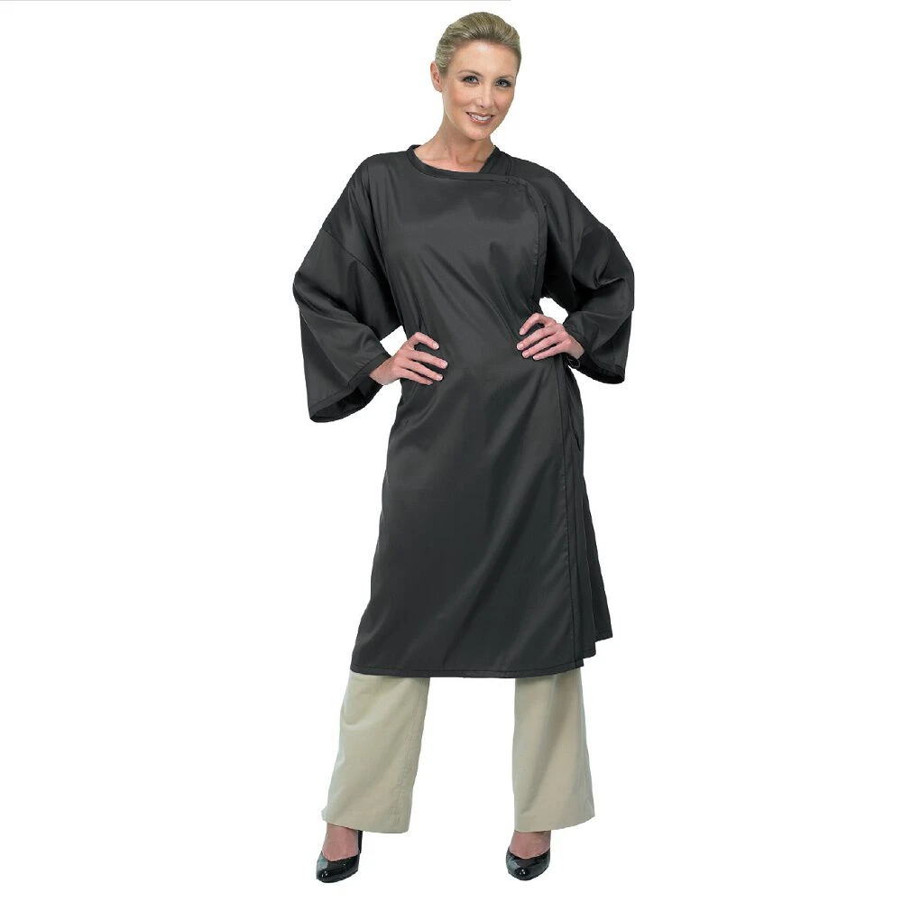 Salon Services Salons Client Gown With Sleeves fits all sizes due to its extra overlap. It is Velcro fastening and water resistant nylon with additional tie at the waist.