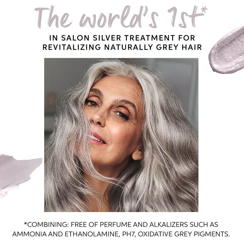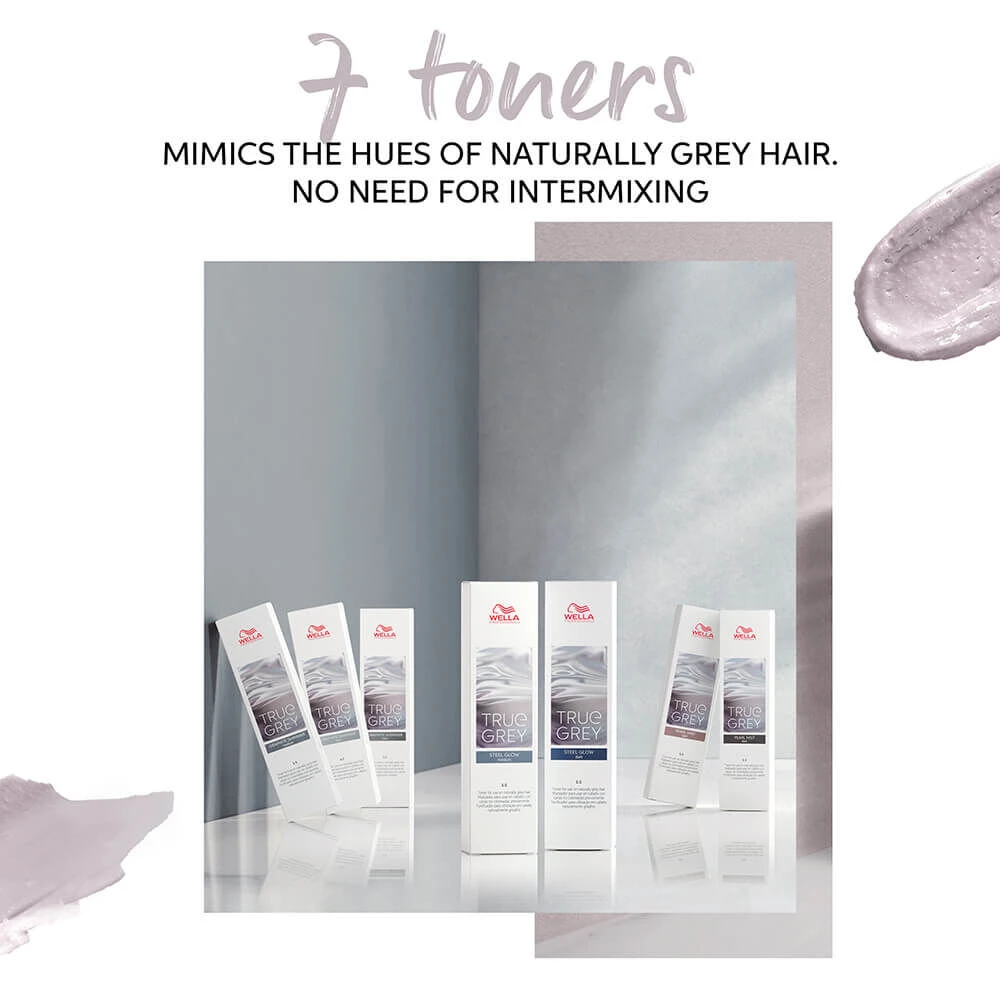 The True Grey series features 7 grey based oxidative toners which mimic the natural hues of beautiful grey hair, with three different intensities of light, medium and dark, to help control dimension and shadow. The tones not only revitalize naturally grey hair but enhance eye colour and skin tones. There is no need to mix the shades, each tone is beautifully crafted to be used pure, mixed with the True Grey Activator.