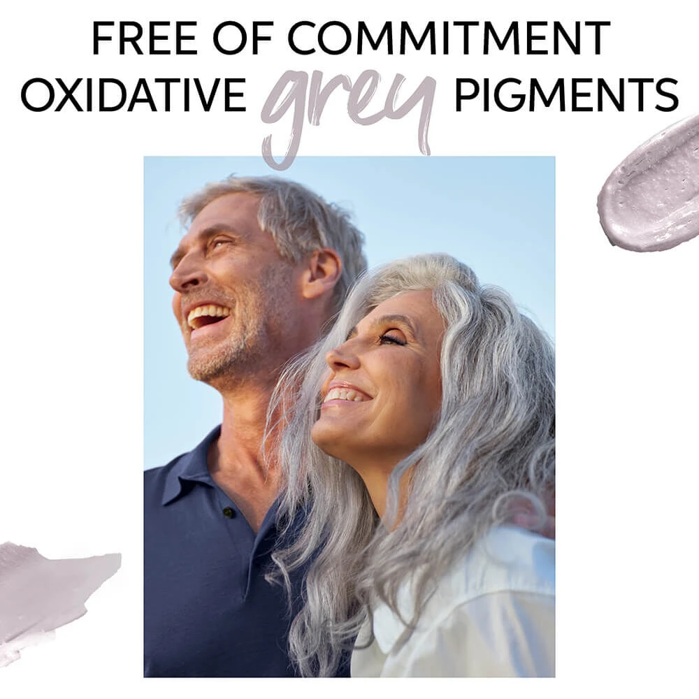 Suitable for different percentages of grey hair, from 50 to 100% grey. Designed without ammonia, MEA, animal derived ingredients and perfume. Dermatologically tested. Oxidative grey pigments.